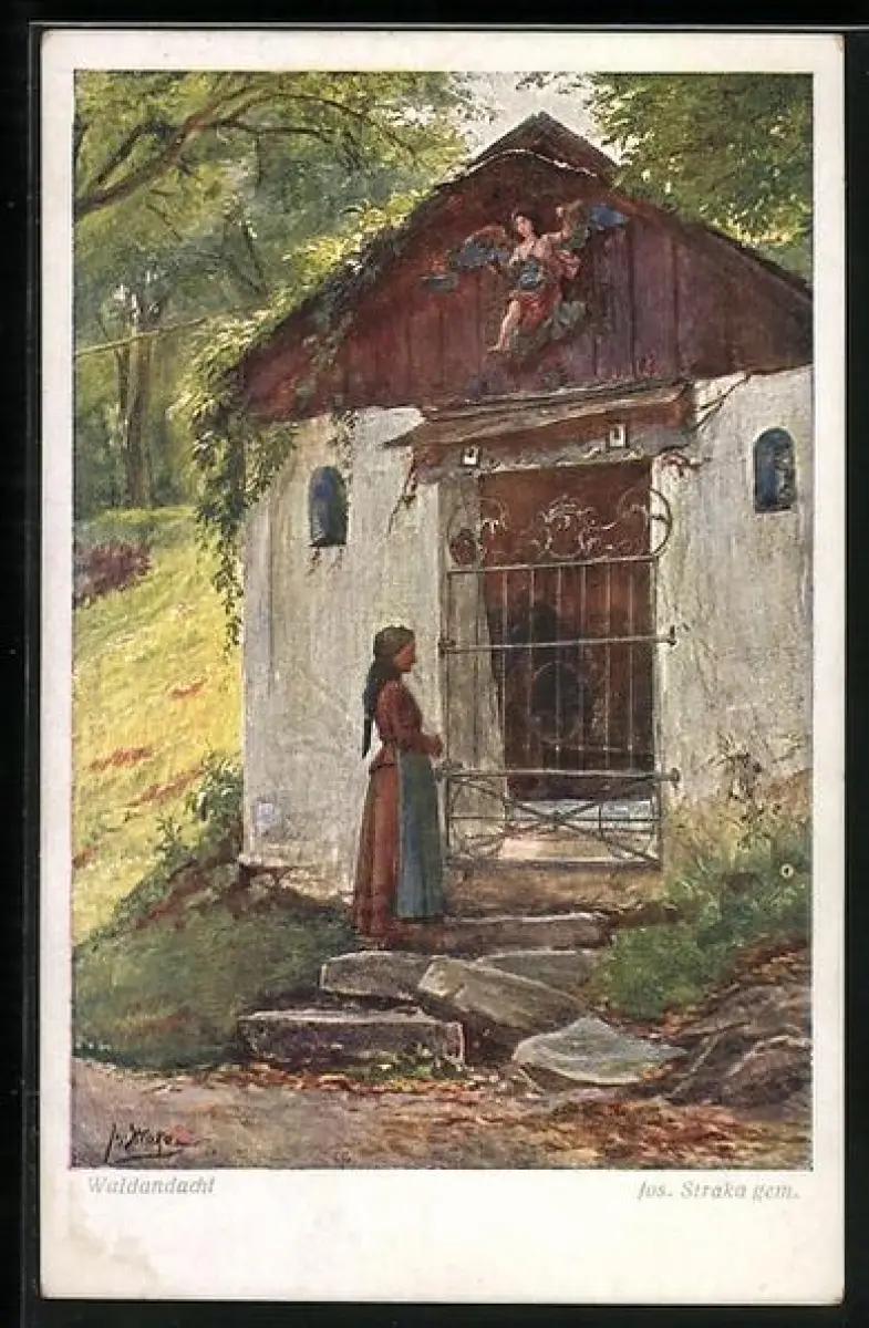 Künstler-AK Josef Straka: Frau vor einer kleinen Kapelle bei einer Andacht