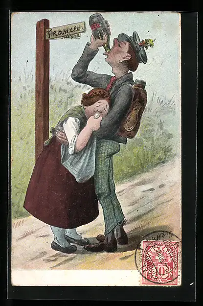 Künstler-AK Junger Mann verlässt das zu Hause, die Mutter weint, er trinkt