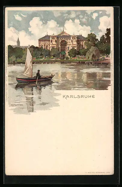 Künstler-AK K. Mutter: Karlsruhe, Blick über den See, Mann im Ruderboot