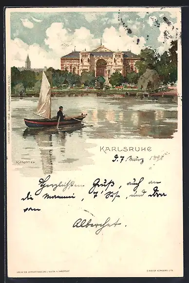 Künstler-AK K. Mutter: Karlsruhe, Mann im Segelboot