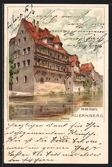 Künstler-AK K. Mutter: Nürnberg, An der Pegnitz mit traditionellen Häusern
