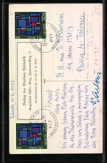 Personenbezogene Daten auf der Rückseite der Karte wurden durch blauen Textmarker unkenntlich gemacht. Die blauen Stellen sind auf die Vorderseite durchgeweicht und wirken sich negativ auf das Postkartenfoto aus