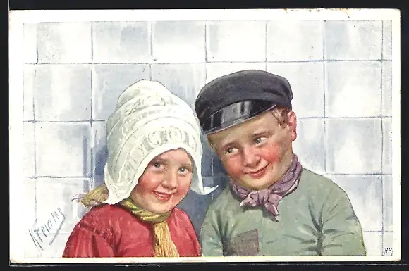 Künstler-AK Karl Feiertag: Verliebtes Kinderpaar in holländischer Tracht