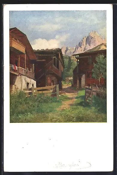 Künstler-AK Karl Maria Schuster: Ramsauer Blockhäuser mit Dachstein