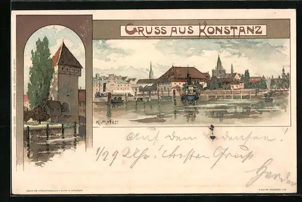 Künstler-AK Karl Mutter: Konstanz, Uferpartie mit Dampfer, Turm