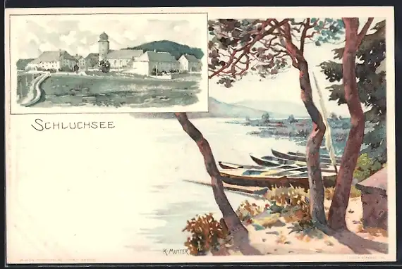 Künstler-AK Karl Mutter: Schluchsee, Teilansicht, Uferpartie mit Booten