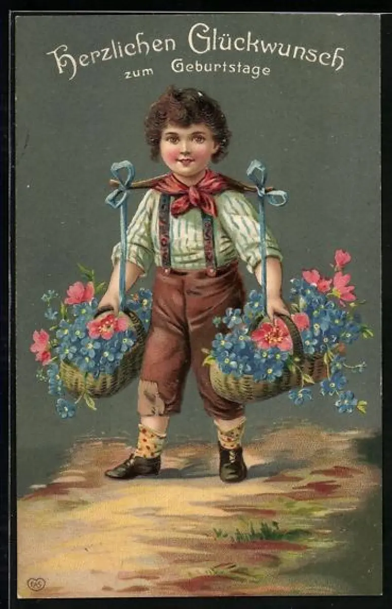 Künstler-AK Kleiner Junge mit Körben voller Blumen, Herzlichen Glückwunsch zum Geburtstage