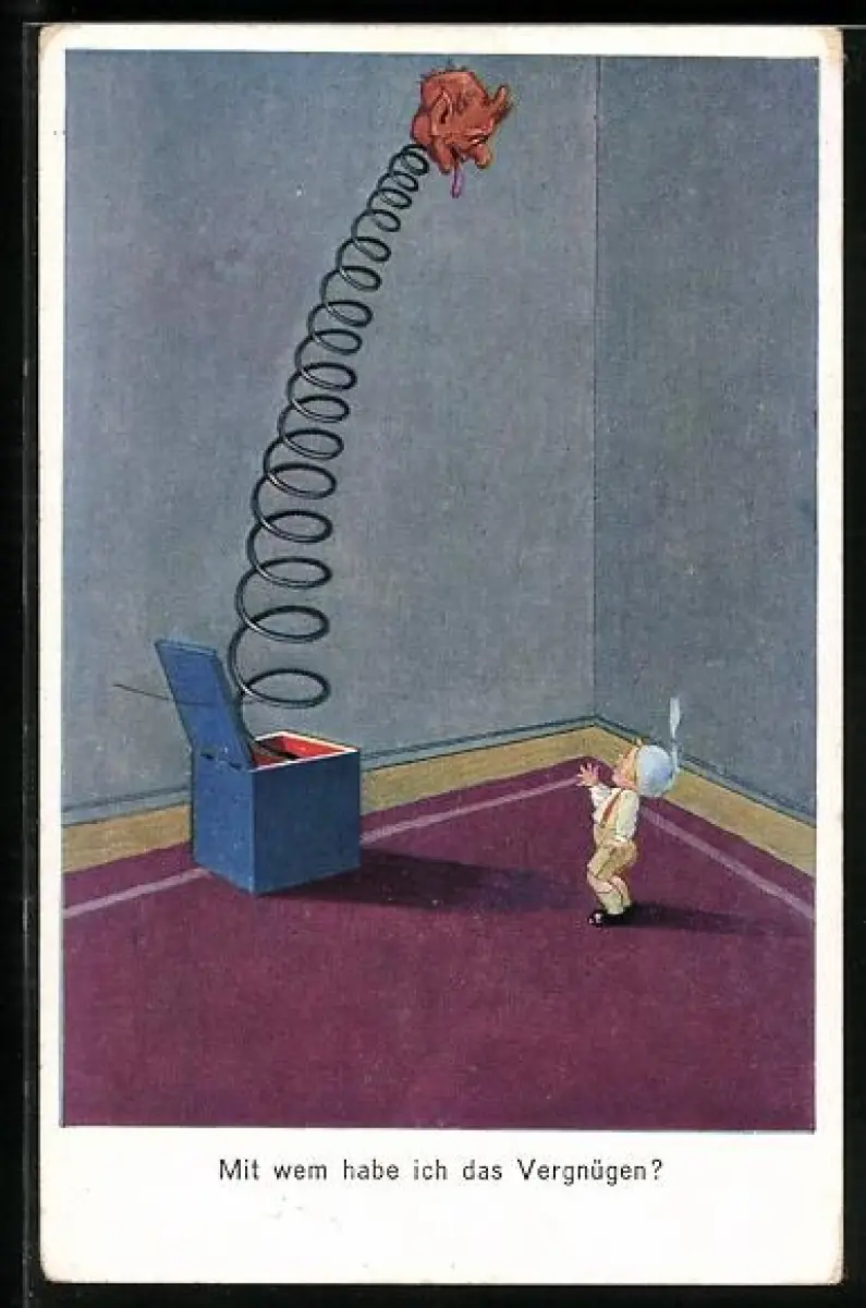 Künstler-AK Kleiner Junge wird von einem Springteufel erschreckt