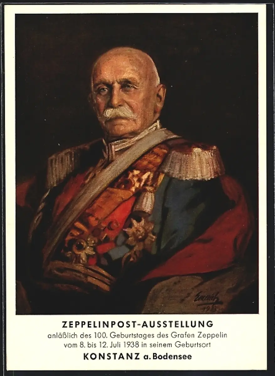 Künstler-AK Konstanz a. Bodensee, Zeppelinpost-Ausstellung, 100. Geburtstag des Grafen Zeppelin 1938, Ganzsache