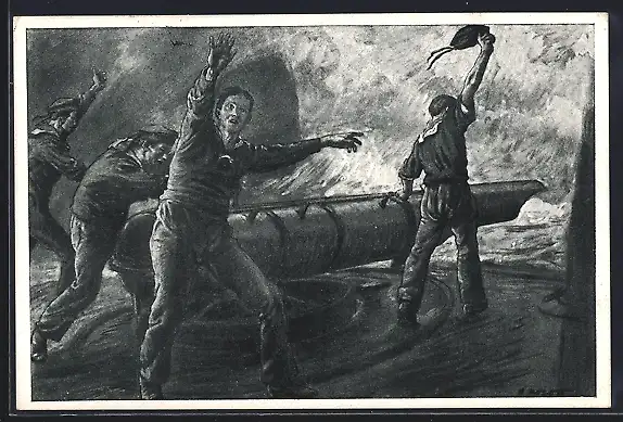 Künstler-AK Kriegsschiff Matrosen am Kanonenrohr im Gefecht