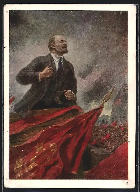 Künstler-AK Lenin mit Fahnen bei einer Rede