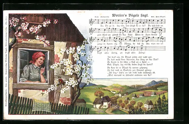 Künstler-AK Lied Worüm`s Vögele singt-Mädchen am Fenster hört dem Vogel zu