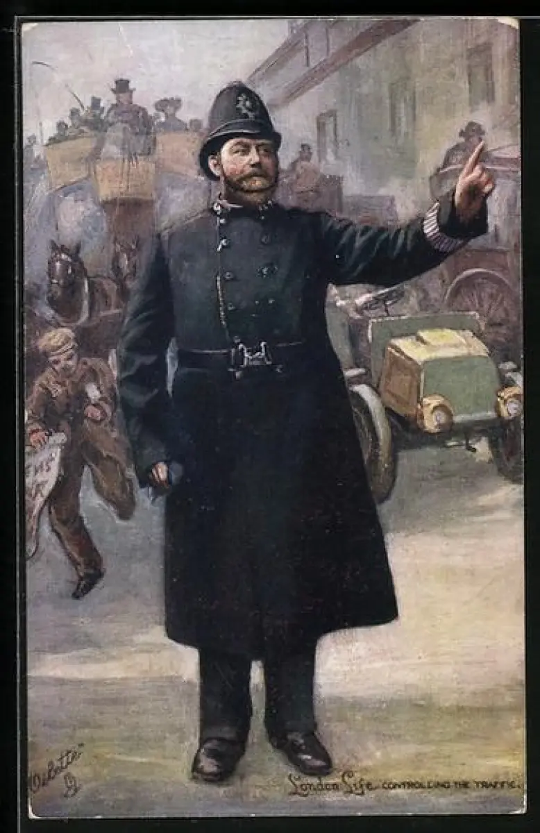 Künstler-AK London, Polizei regelt den Verkehr, Police controlling the Traffic