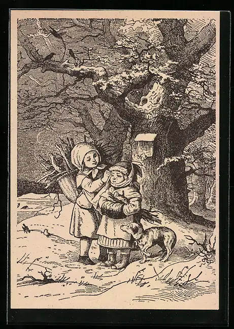 Künstler-AK Ludwig Richter: Weine nur nicht Helmchen, Schwester wischt ihrem Brüderchen die Tränen vom Gesicht, Hund