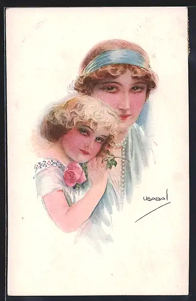 Künstler-AK Luis Usabal: Elegante Frau mit ihrer blonden Tochter