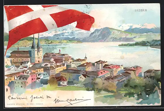 Künstler-AK Luzern, Teilansicht mit Flagge