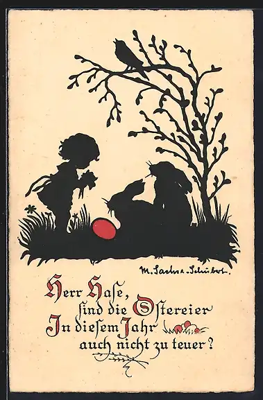 Künstler-AK M. Sachse-Schubert: Scherenschnitt, Mädchen auf einer Wiese sieht zwei Hasen