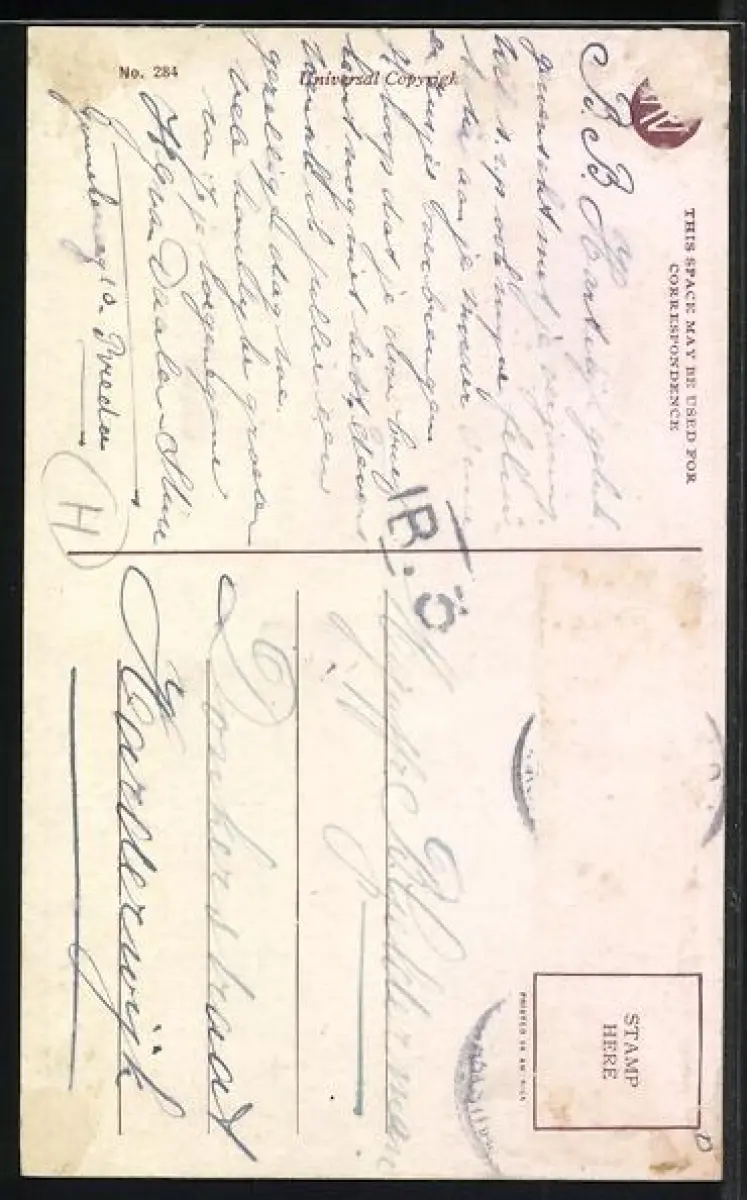 alte Ansichtskarte, gelaufen, Briefmarke entfernt, rückseitig Oberflächenschaden, rückseitig Klebe- und Papierreste, guter Zustand