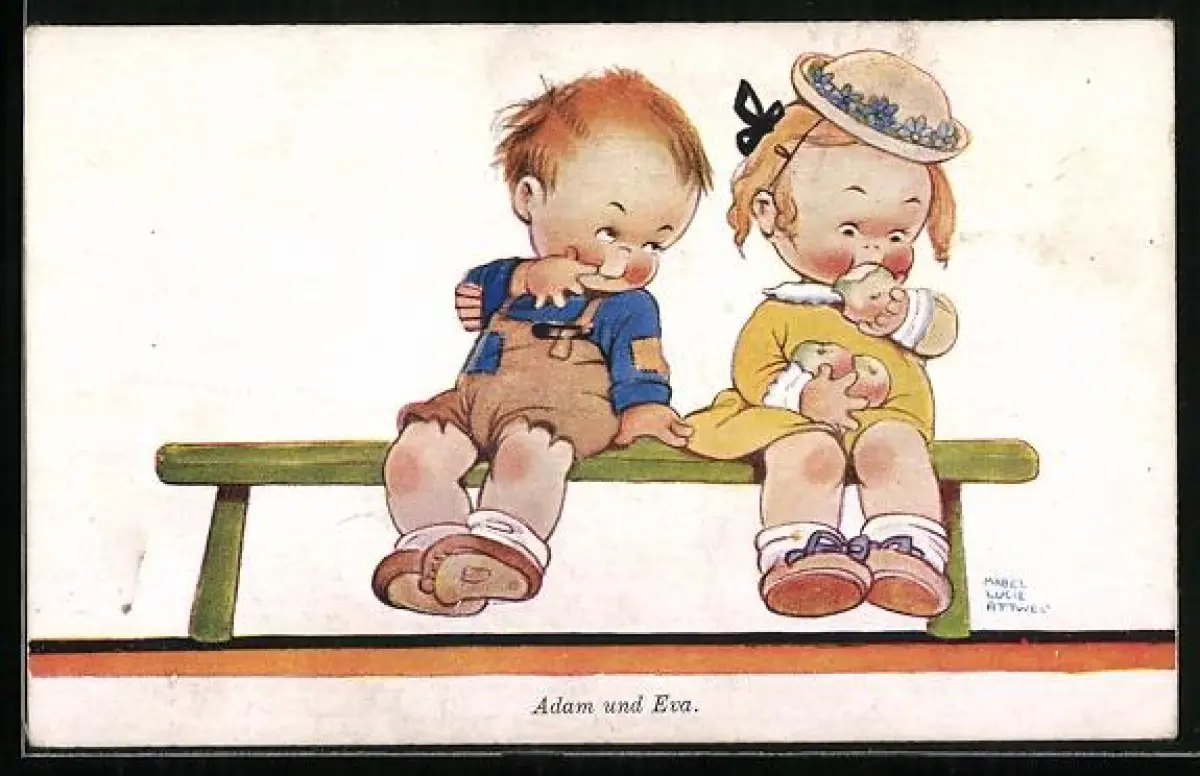 Künstler-AK Mabel Lucie Attwell: Adam und Eva, Mädchen beisst in einen Apfel