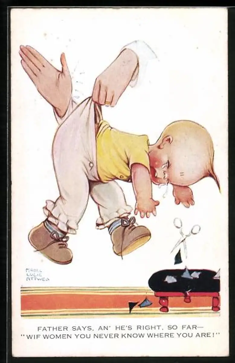 Künstler-AK Mabel Lucie Attwell: Weinendes Kleinkind kriegt einen Klaps, Father says, an` he`s right, so far