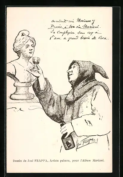 Künstler-AK Mann gibt einer Büste Mariani-Wein, Reklame