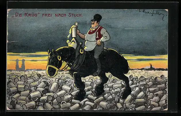 Künstler-AK Mann mit Bierkrug auf Pferd reitet über leere Krüge, Trinkerhumor