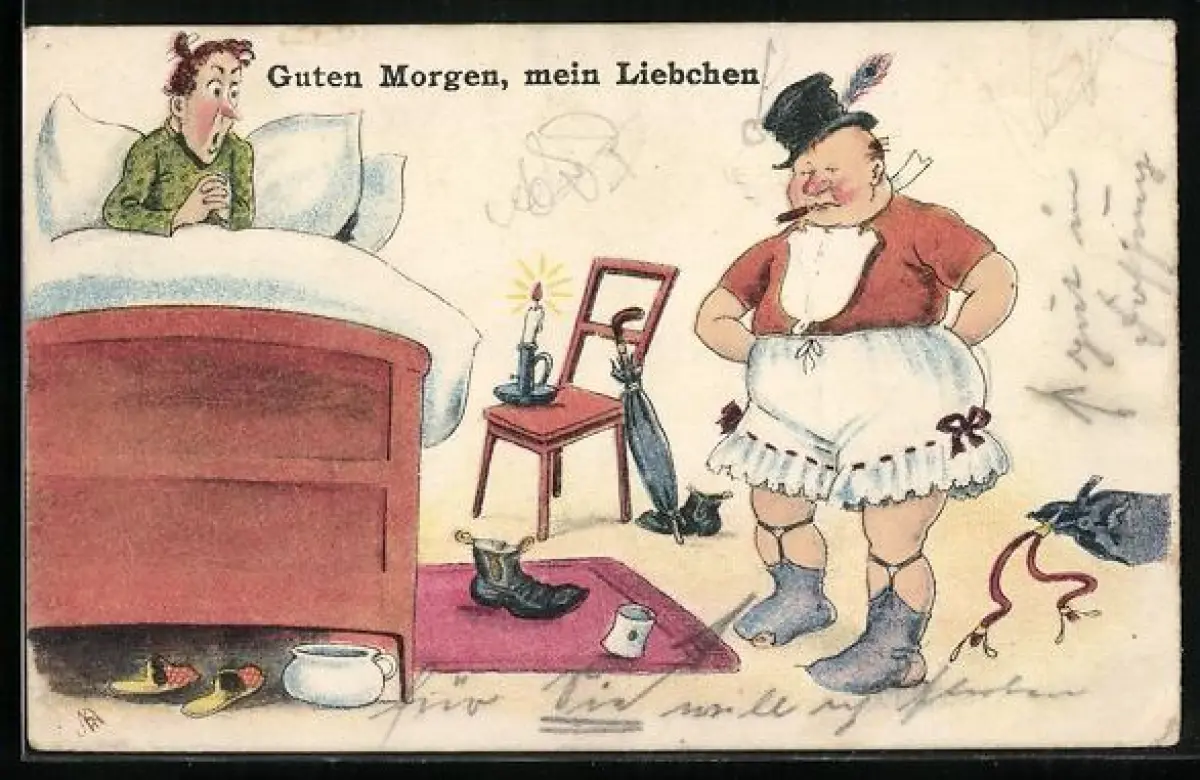 Künstler-AK Mann mit Hut steht neben dem Bett in den Höschen seiner Frau