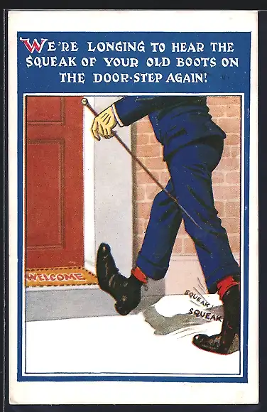 Künstler-AK Mann mit quietschenden Schuhen vor einer Haustür