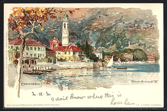 Künstler-AK Manuel Wielandt: Cernobbio, Bootsanlegestelle am Ufer neben der Kirche