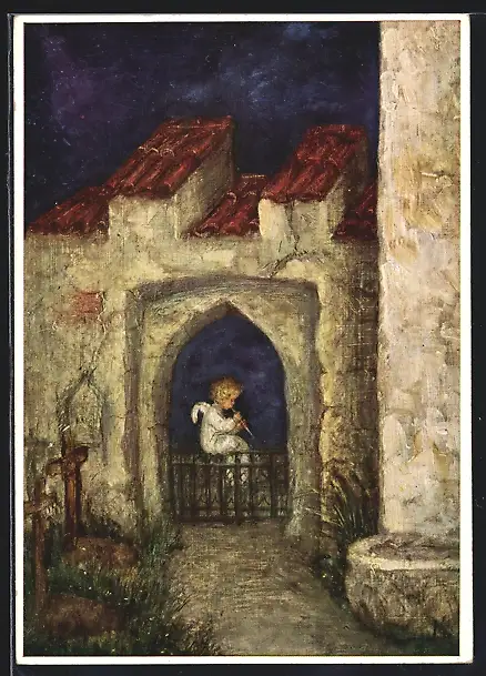 Künstler-AK Maria Spötl: Engel spielt Flöte am Tor, Ein Lied von drüben