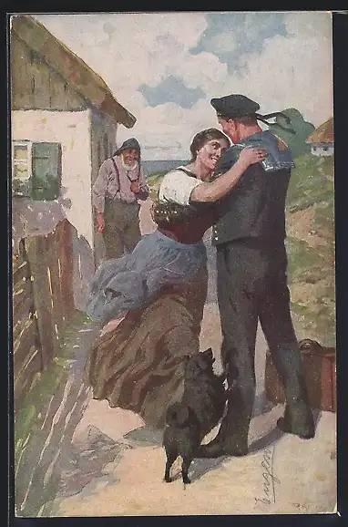 Künstler-AK Matrose kehrt zu seiner grossen Liebe nach dem Krieg zurück