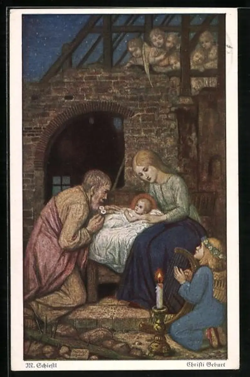 Künstler-AK Matthäus Schiestl: Christi Geburt, Engel musizieren beim Stall mit der Krippe