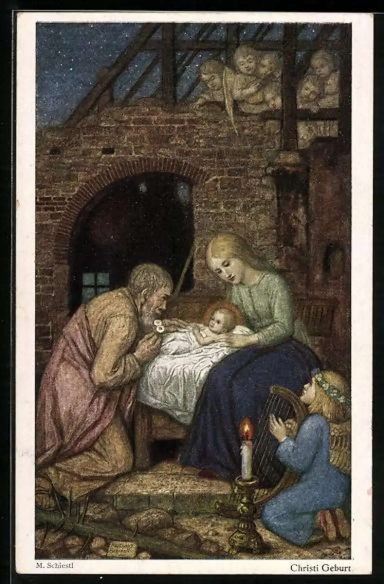 Künstler-AK Matthäus Schiestl: Christi Geburt, Engel musizieren beim Stall mit der Krippe