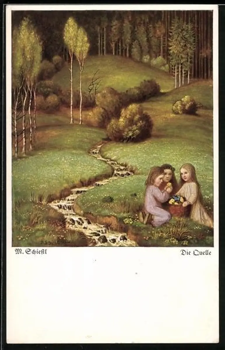 Künstler-AK Matthäus Schiestl: Mädchen pflücken Blumen an einer Quelle