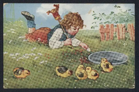 Künstler-AK Maxim Trübe: Kind mit Steckenpferd spielt mit Küken