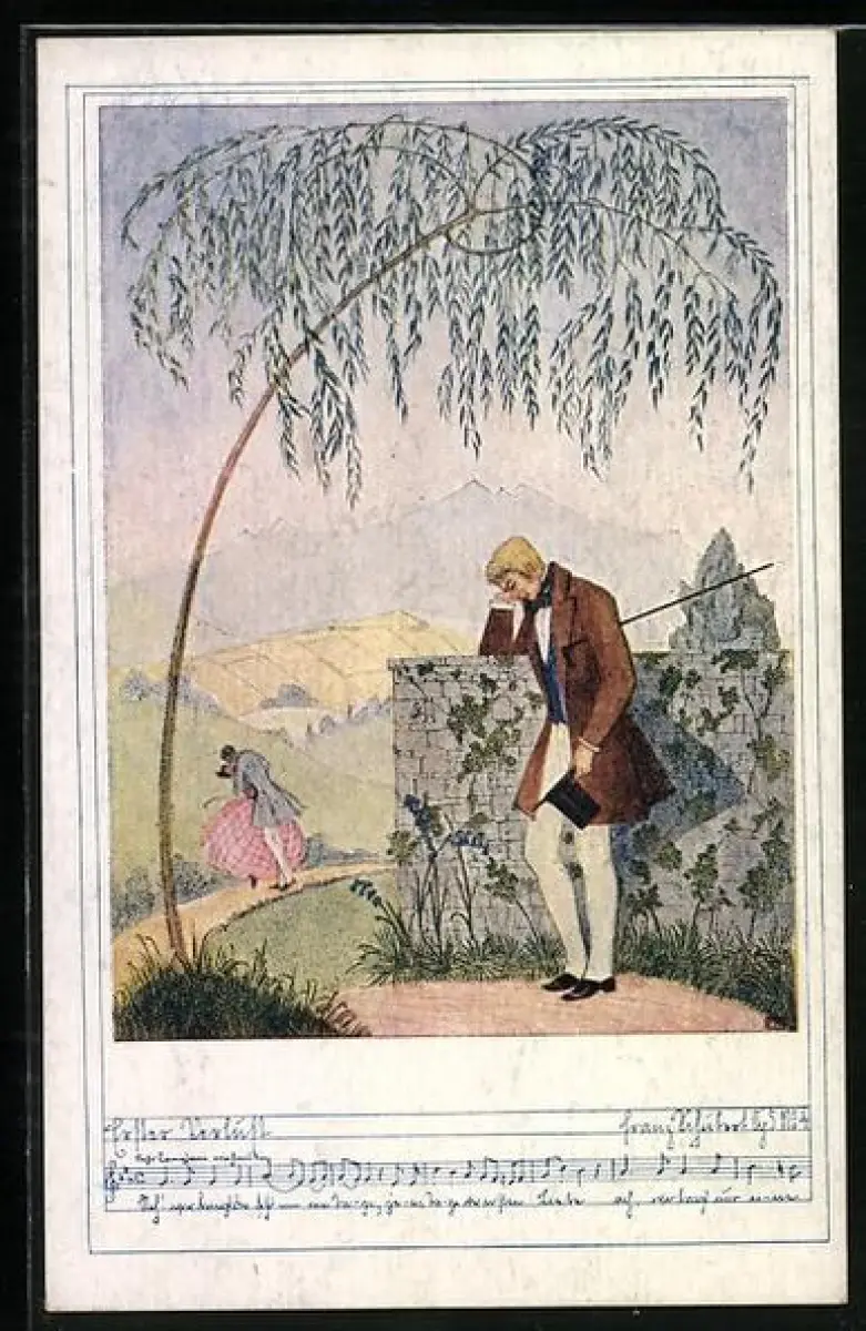 Künstler-AK Mela Köhler: Abgewiesener Verehrer bei einer Trauerweide und ein Liebespaar, Deutscher Schulverein