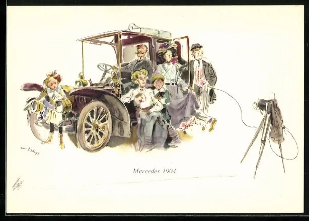 Künstler-AK Mercedes-Benz, Familienfoto mit Mercedes 1904