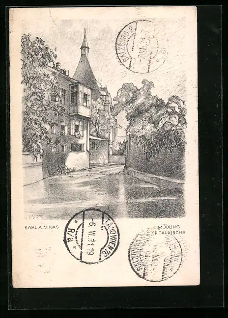 Künstler-AK Mödling, Partie an der Spitalkirche
