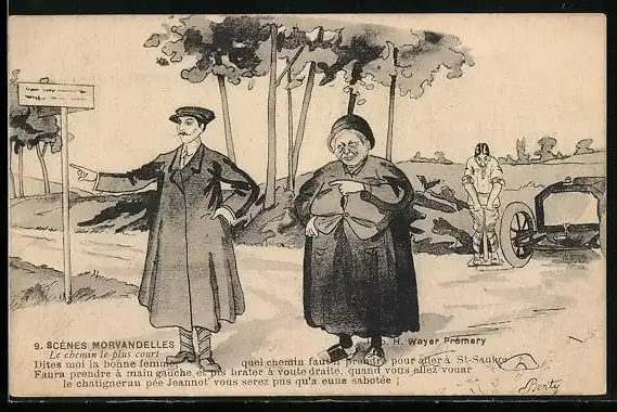 Künstler-AK Morvan, Scènes Morvandelles, Frau pumpt einen Autoreifen auf, Im Vordergrund eleganter Herr und Frau, Scherz