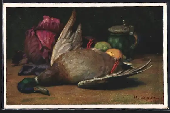 Künstler-AK N. Davis: Jagdstillleben mit Ente