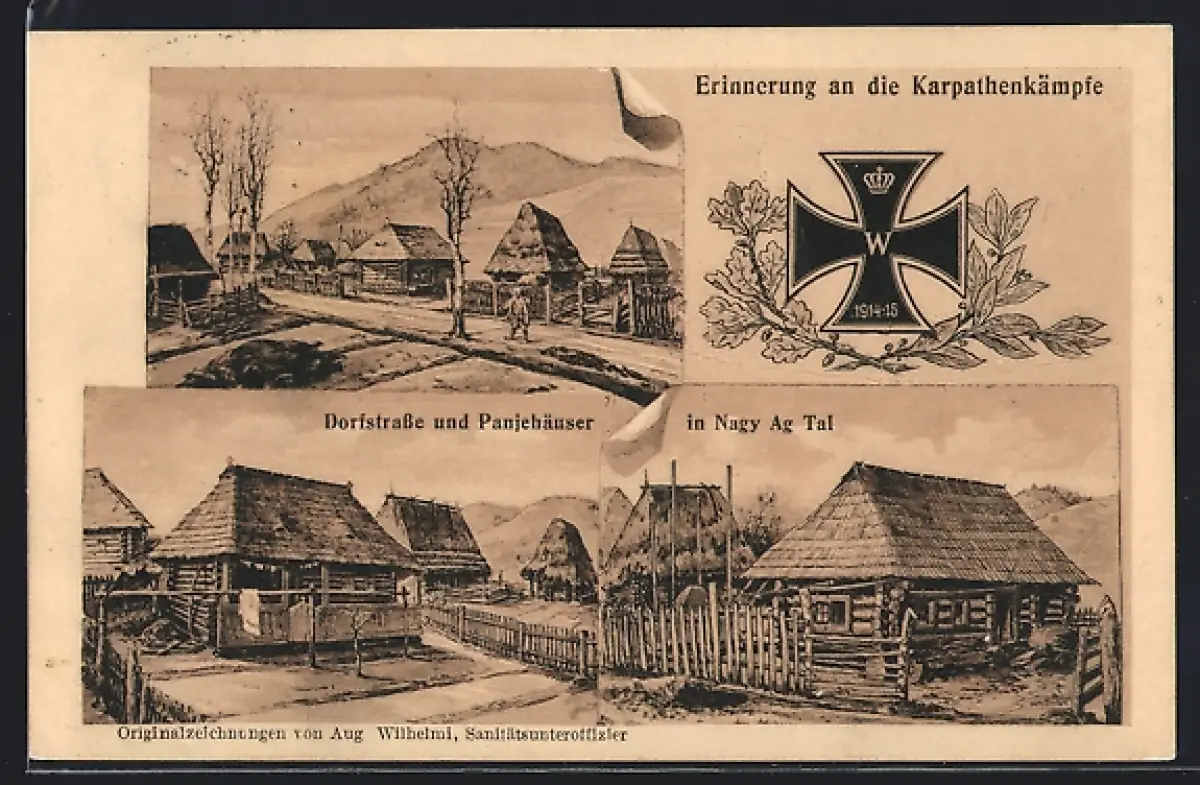 Künstler-AK Nagy Ag Tal, Karpathenkämpfe 1914-15, Dorfstrasse und Panjehäuser