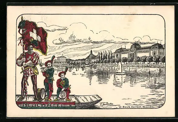 Künstler-AK Neuchâtel, Uferpartie, Boot mit Wächter