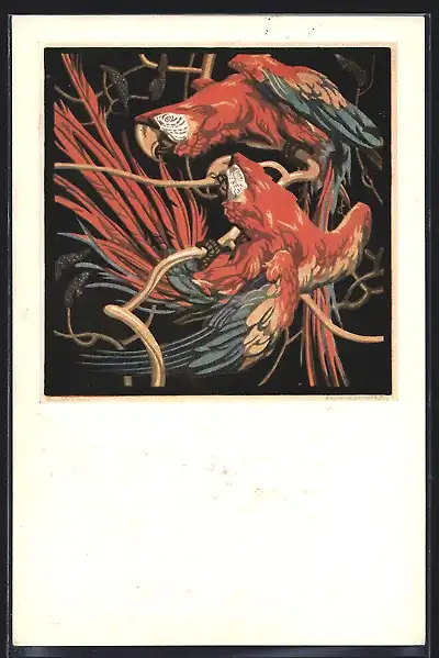 Künstler-AK Norbertine Bresslern-Roth: rote Aras auf einem Ast