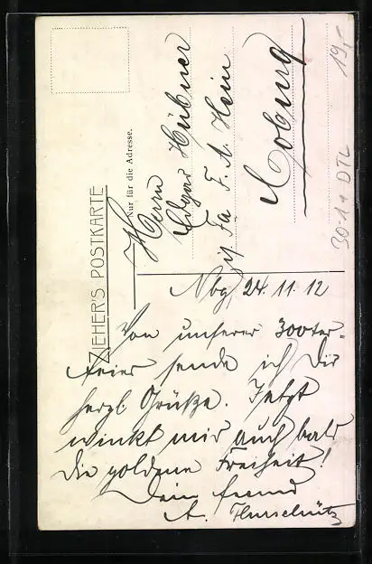 Personenbezogene Daten auf der Rückseite der Karte wurden durch blauen Textmarker unkenntlich gemacht. Die blauen Stellen sind auf die Vorderseite durchgeweicht und wirken sich negativ auf das Postkartenfoto aus