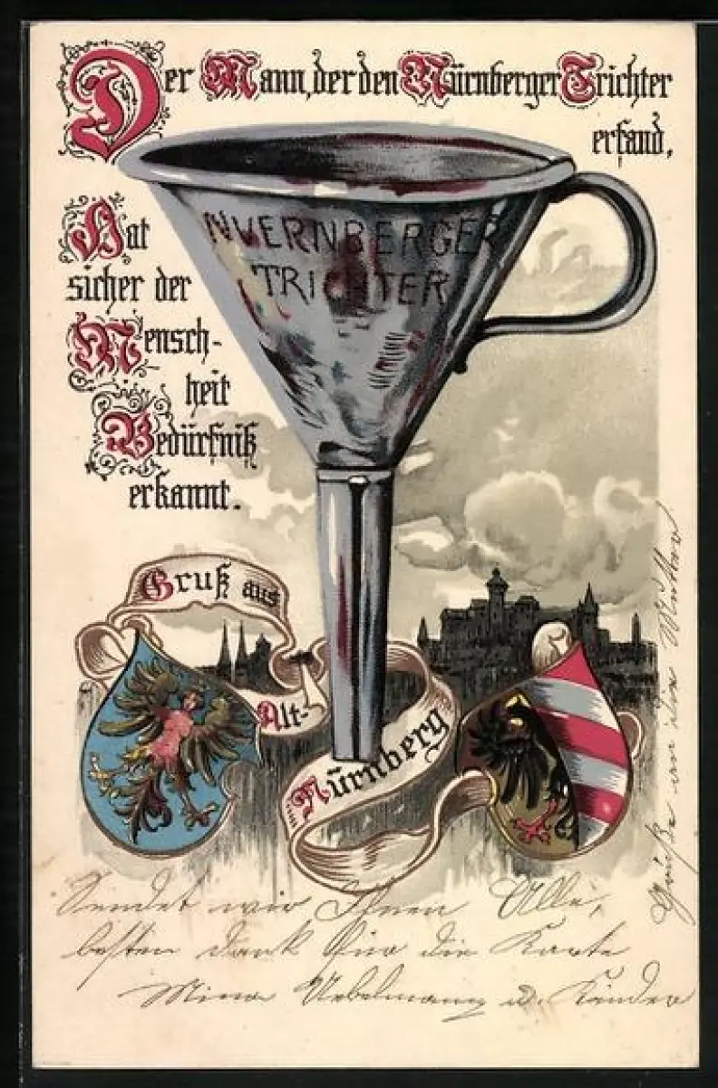 Künstler-AK Nürnberg, Nürnberger Trichter mit Stadt im Hintergrund, Wappen