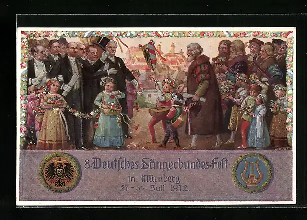 Künstler-AK Nürnberg, VIII. Deutsches Sängerbundfest 1912, geschmückte Kinder, Wappen