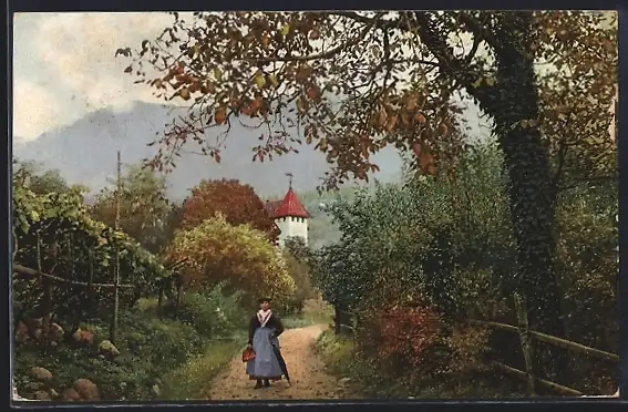 Künstler-AK Obermais bei Meran, Frau in Tracht auf dem Weg in den Ort