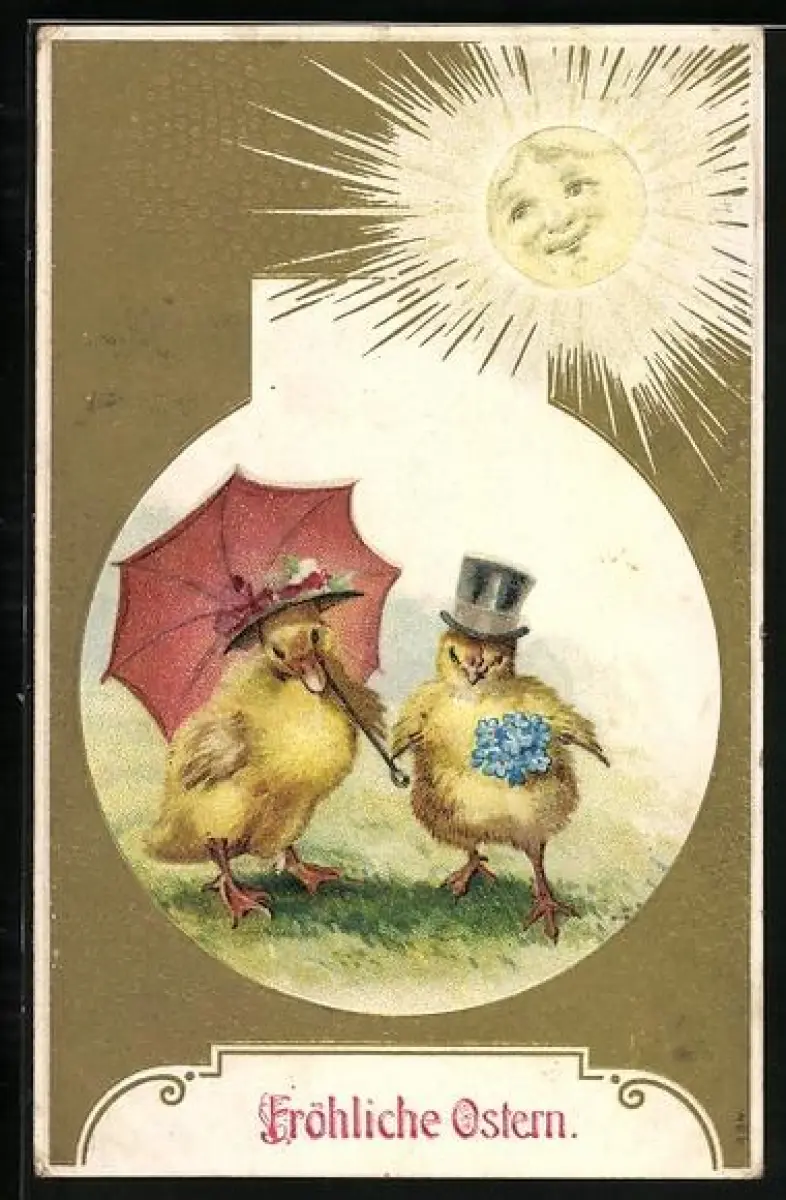 Künstler-AK Osterküken Zylinder und Blumen spaziert mit Entenküken mit Schirm, Fröhliche Ostern