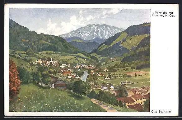Künstler-AK Otto Stoitzner: Scheibbs, Ortsansicht mit Ötscher