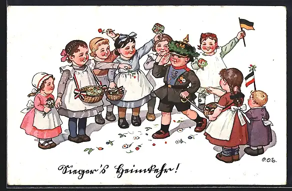 Künstler-AK P. O. Engelhard (P.O.E.): Mädchen begrüssen den heimkehrenden kleinen Soldaten